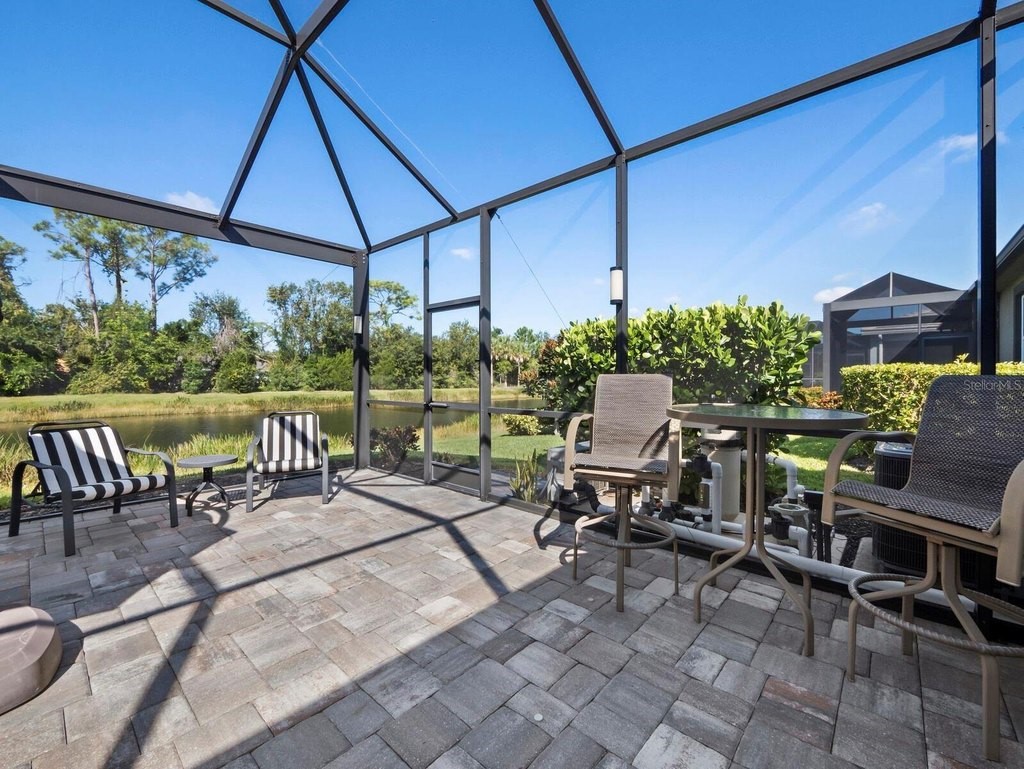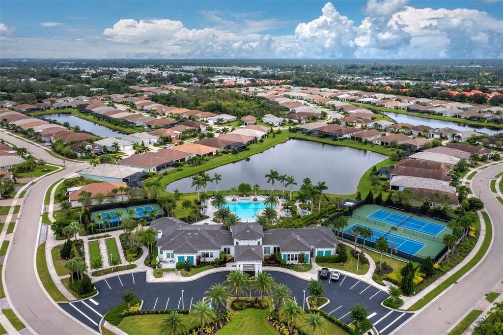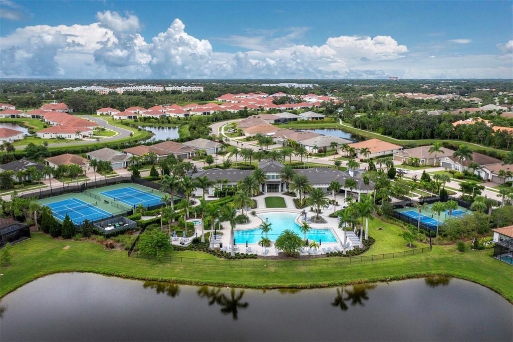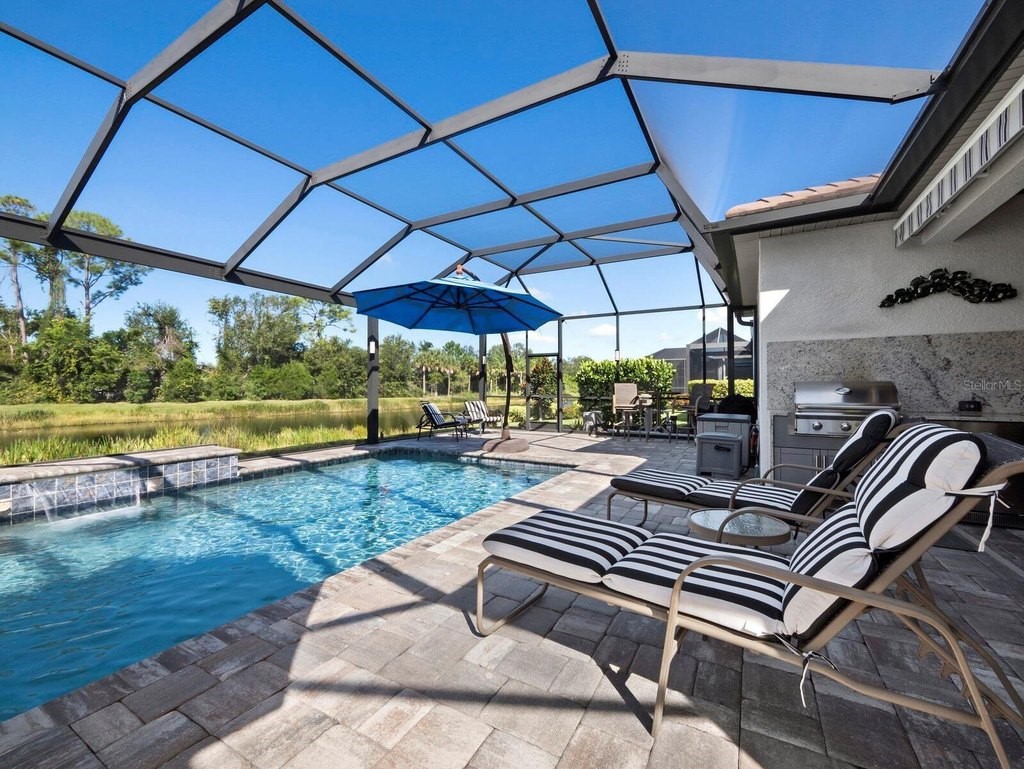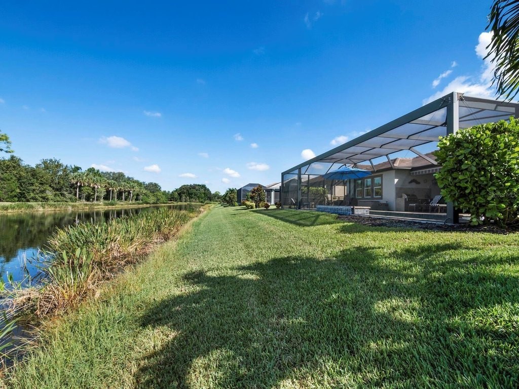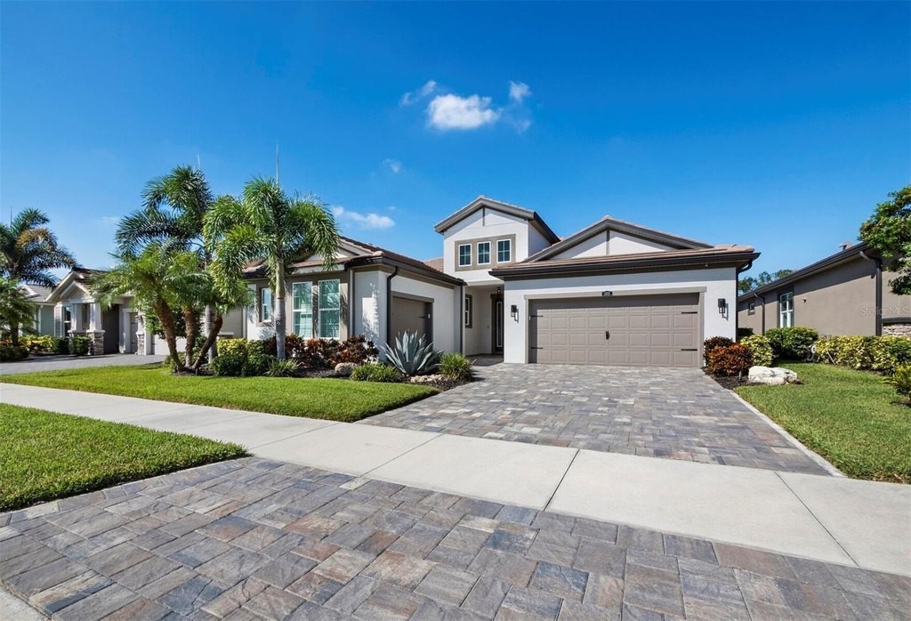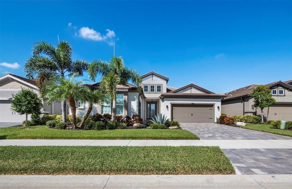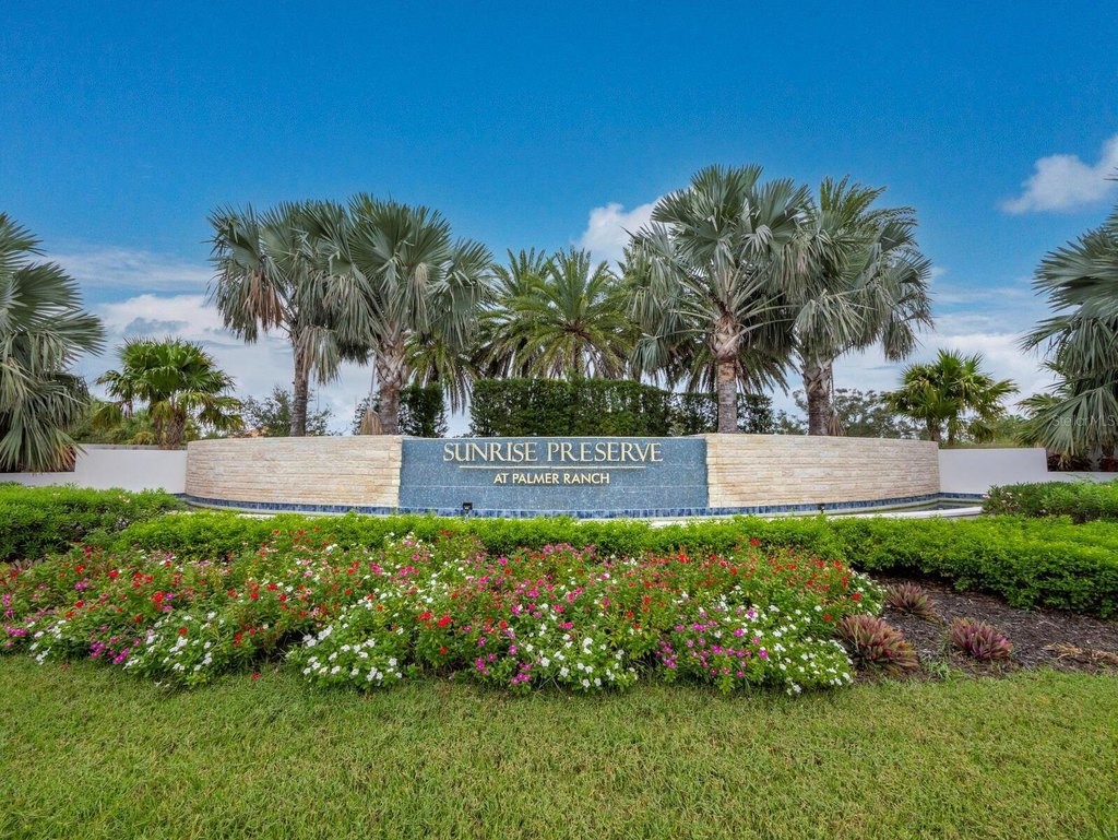 Under contract-accepting backup offers. Built in 2020, this West Indies-style home exudes sophistication with extensive upgrades and stunning natural light. Ideally situated on a lakefront home site, the property offers picturesque preserve and water views. Every high-end detail, meticulously completed in this gated Sunrise Preserve gem, offers immediate luxury upon arrival. The immaculate floor plan includes 2, 261 sq. ft. of thoughtfully designed living space, featuring 3 bedrooms, 3 bathrooms, a pool, and 3-car split garage with epoxy floors and upgraded paver driveway. Lush, tropical landscaping accented by hard wired LED lights provide impressive curb appeal. The welcoming front entrance sets the stage leading into the home with commanding views. Upon entering through the striking glass front door, the tone is set for the entire space. The large interior open layout features 9-10 ft ceilings paired with tray ceilings and crown molding, adding to the sense of spacious elegance. Plank tile floors flow throughout the home, complemented by tasteful designer touches such as upgraded light fixtures, plantation shutters, custom storage closets, and ceiling fans. Adjacent to the great room, a gourmet kitchen includes sleek cabinets, upgraded stainless steel appliances, and a generous walk-in pantry with a frosted glass door. Premium quartz countertops extend to a spacious island featuring an upgraded kitchen sink for both style and practicality. The dining room seamlessly blends entertaining with amazing outdoor views. The screened-in lanai enhanced with additional lighting, creates an appealing transition from the great room through the hurricane impact sliding door. Step outside to the custom saltwater pool complete with colored lights, fountain bubbler, motorize sunshade, and a one-sided automatic privacy screen. A pool lounge area atop pavers and a summer outdoor kitchen completes this idyllic space for relaxing while enjoying tranquil lake views. The spacious primary suite features a well-appointed bathroom, with a large walk-in custom closet. Highlights of this luxurious en-suite bath include split dual vanities, premium granite countertops, and large walk-in shower with a bench. The split floor plan provides two additional bedrooms with custom closets and spa-like baths. The third bedroom can easily transform into an office with the custom desk, adding versatility to the home. The spacious laundry room designed for convenience, offering a barn door with frosted glass, lower cabinets with a utility sink, and two storage closets. Further upgrades include impact windows, hard-wired security package with two cameras, split AC systems, whole house natural gas generator, house surge protector, a 5.1 surround sound system, and a freshly painted interior (2023). The HOA fee includes complete landscape maintenance. Situated in the Gated Sunrise Preserve at Palmer Ranch, residents enjoy an affluence of amenities that exemplify resort-style living. These include a large clubhouse with a fitness center, yoga room, a spectacular heated pool and spa, bar lounge area, bocce ball, tennis courts, and more. This community is conveniently located near fabulous Gulf beaches, shopping, fine dining, medical facilities, and top-rated schools, providing a truly upscale living experience.