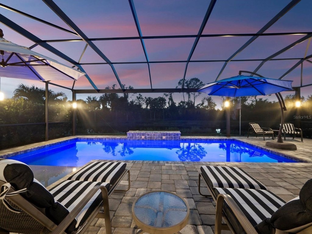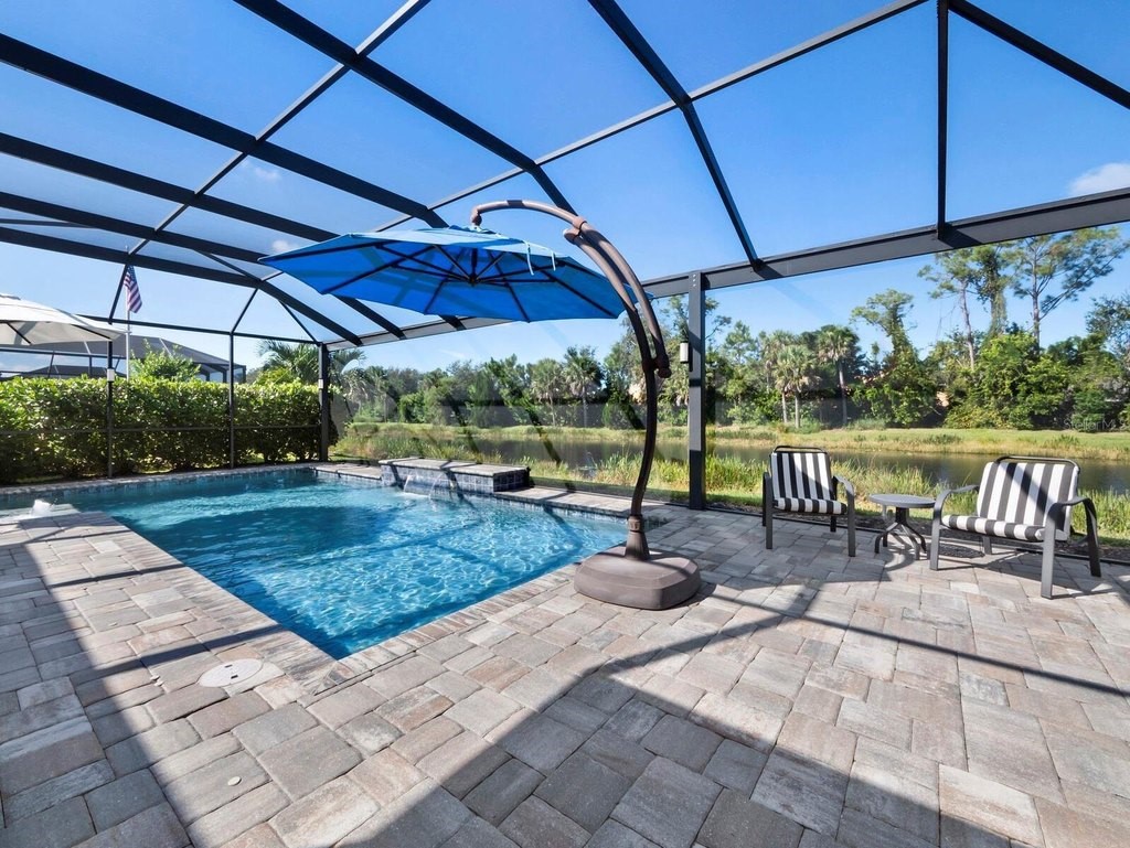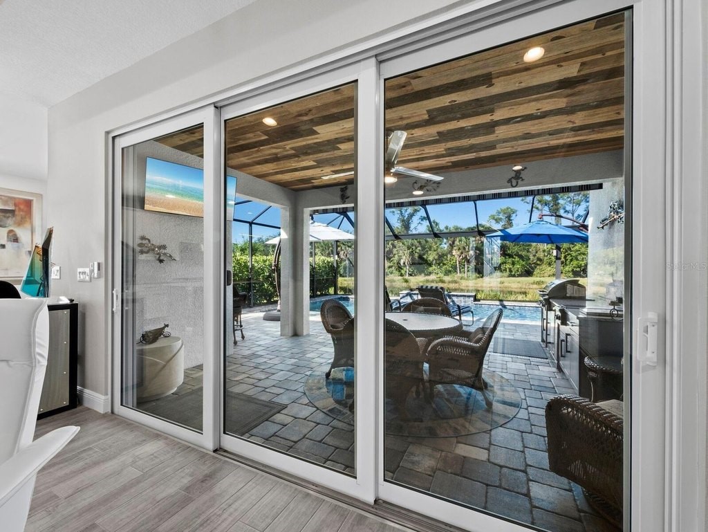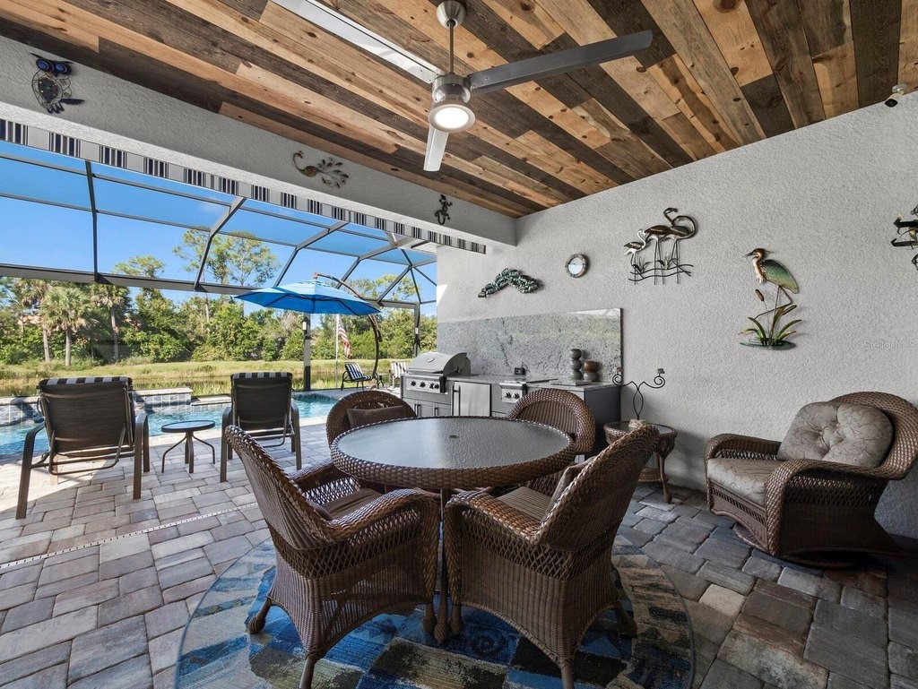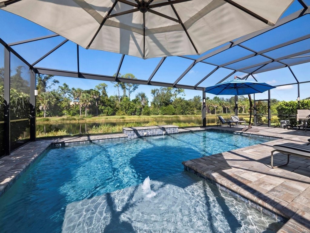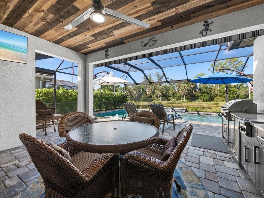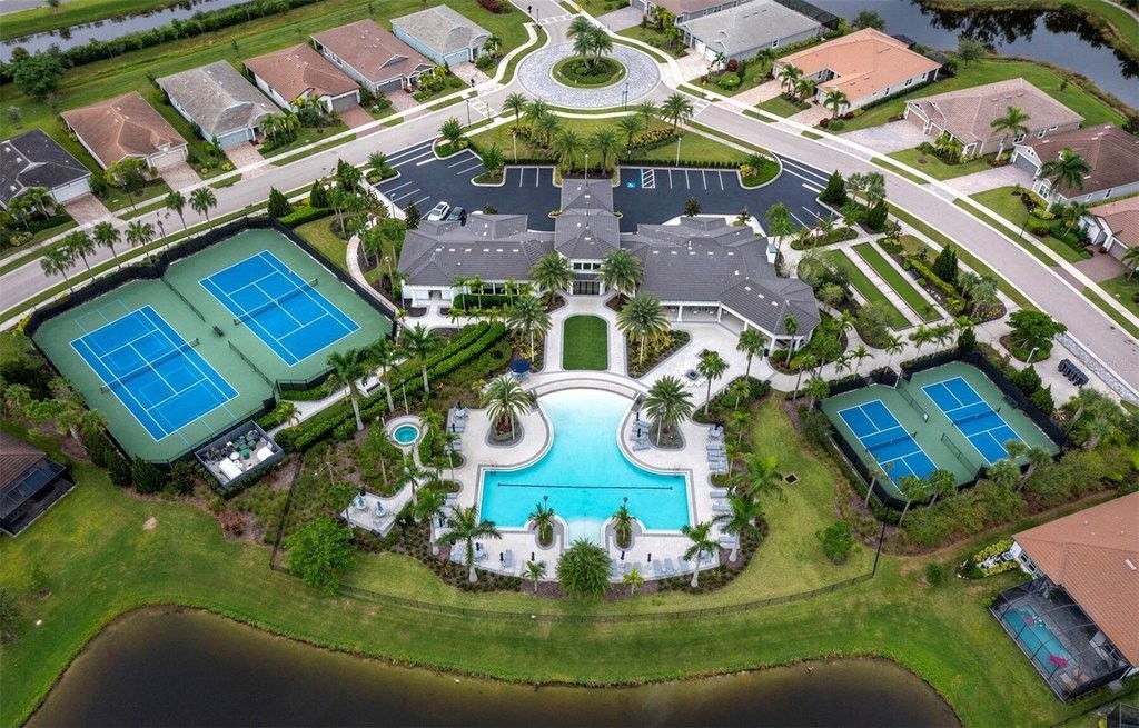 Under contract-accepting backup offers. Built in 2020, this West Indies-style home exudes sophistication with extensive upgrades and stunning natural light. Ideally situated on a lakefront home site, the property offers picturesque preserve and water views. Every high-end detail, meticulously completed in this gated Sunrise Preserve gem, offers immediate luxury upon arrival. The immaculate floor plan includes 2, 261 sq. ft. of thoughtfully designed living space, featuring 3 bedrooms, 3 bathrooms, a pool, and 3-car split garage with epoxy floors and upgraded paver driveway. Lush, tropical landscaping accented by hard wired LED lights provide impressive curb appeal. The welcoming front entrance sets the stage leading into the home with commanding views. Upon entering through the striking glass front door, the tone is set for the entire space. The large interior open layout features 9-10 ft ceilings paired with tray ceilings and crown molding, adding to the sense of spacious elegance. Plank tile floors flow throughout the home, complemented by tasteful designer touches such as upgraded light fixtures, plantation shutters, custom storage closets, and ceiling fans. Adjacent to the great room, a gourmet kitchen includes sleek cabinets, upgraded stainless steel appliances, and a generous walk-in pantry with a frosted glass door. Premium quartz countertops extend to a spacious island featuring an upgraded kitchen sink for both style and practicality. The dining room seamlessly blends entertaining with amazing outdoor views. The screened-in lanai enhanced with additional lighting, creates an appealing transition from the great room through the hurricane impact sliding door. Step outside to the custom saltwater pool complete with colored lights, fountain bubbler, motorize sunshade, and a one-sided automatic privacy screen. A pool lounge area atop pavers and a summer outdoor kitchen completes this idyllic space for relaxing while enjoying tranquil lake views. The spacious primary suite features a well-appointed bathroom, with a large walk-in custom closet. Highlights of this luxurious en-suite bath include split dual vanities, premium granite countertops, and large walk-in shower with a bench. The split floor plan provides two additional bedrooms with custom closets and spa-like baths. The third bedroom can easily transform into an office with the custom desk, adding versatility to the home. The spacious laundry room designed for convenience, offering a barn door with frosted glass, lower cabinets with a utility sink, and two storage closets. Further upgrades include impact windows, hard-wired security package with two cameras, split AC systems, whole house natural gas generator, house surge protector, a 5.1 surround sound system, and a freshly painted interior (2023). The HOA fee includes complete landscape maintenance. Situated in the Gated Sunrise Preserve at Palmer Ranch, residents enjoy an affluence of amenities that exemplify resort-style living. These include a large clubhouse with a fitness center, yoga room, a spectacular heated pool and spa, bar lounge area, bocce ball, tennis courts, and more. This community is conveniently located near fabulous Gulf beaches, shopping, fine dining, medical facilities, and top-rated schools, providing a truly upscale living experience.