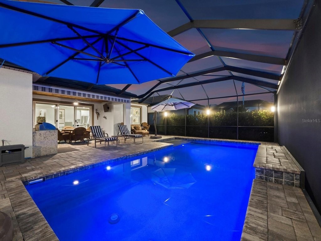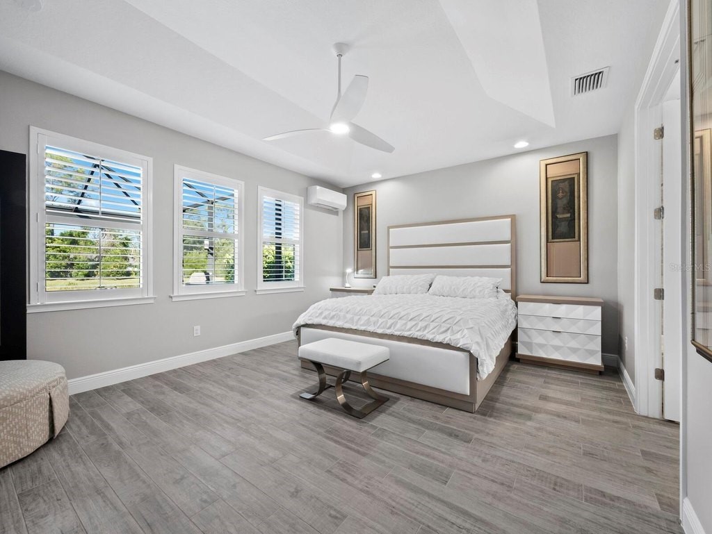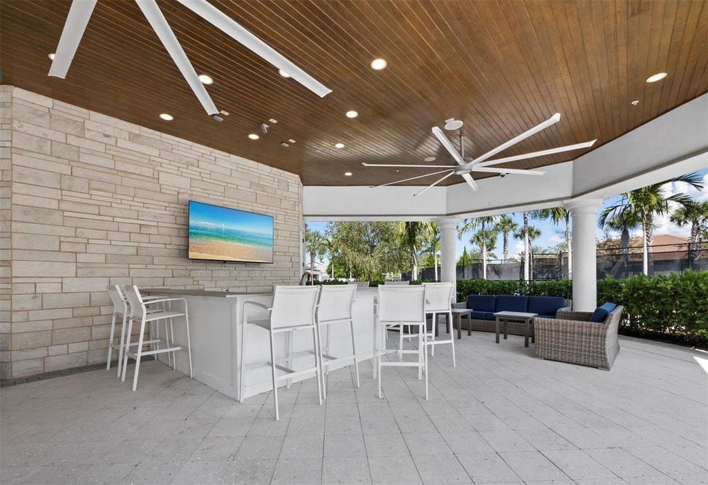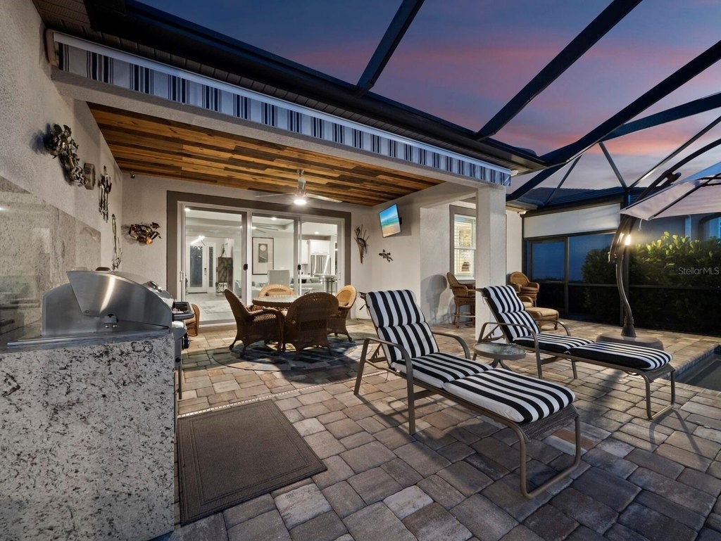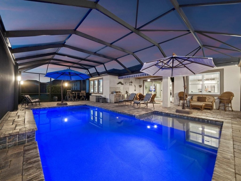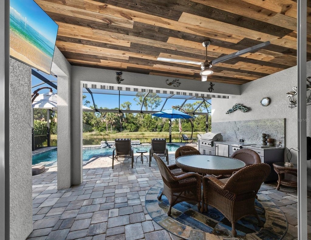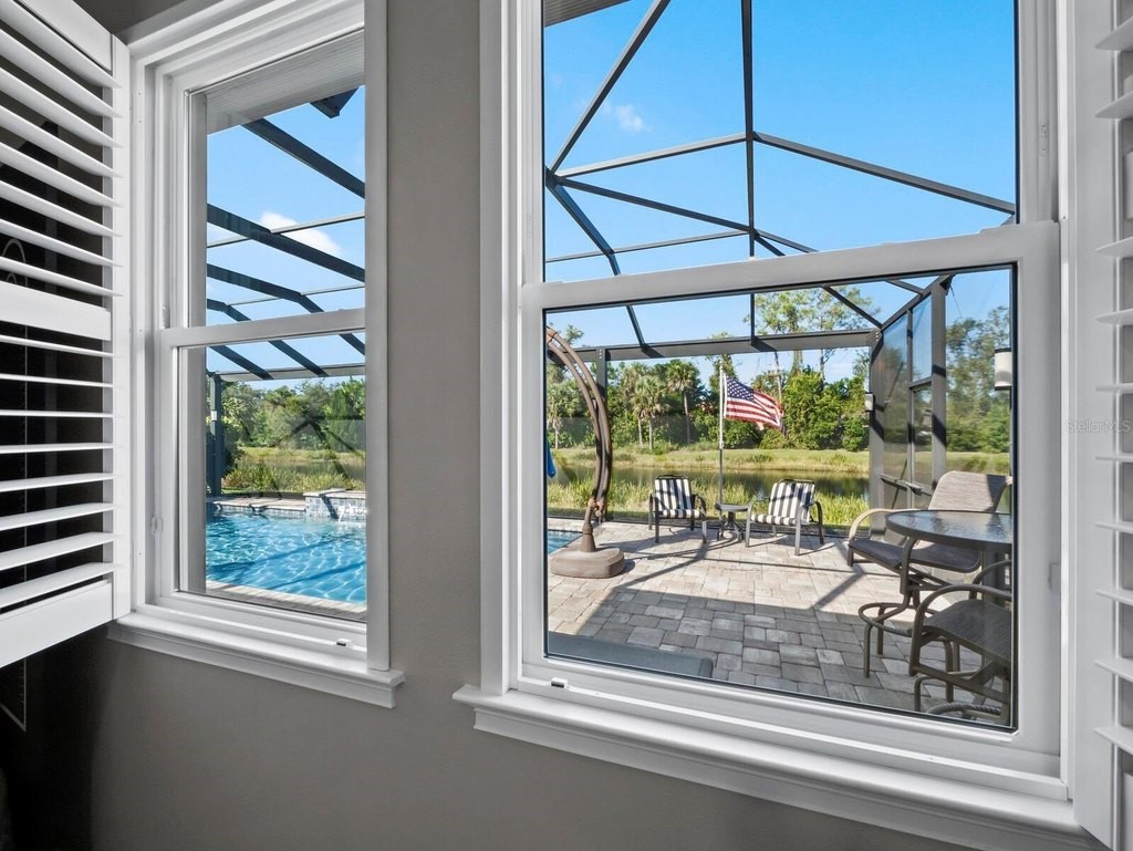 Under contract-accepting backup offers. Built in 2020, this West Indies-style home exudes sophistication with extensive upgrades and stunning natural light. Ideally situated on a lakefront home site, the property offers picturesque preserve and water views. Every high-end detail, meticulously completed in this gated Sunrise Preserve gem, offers immediate luxury upon arrival. The immaculate floor plan includes 2, 261 sq. ft. of thoughtfully designed living space, featuring 3 bedrooms, 3 bathrooms, a pool, and 3-car split garage with epoxy floors and upgraded paver driveway. Lush, tropical landscaping accented by hard wired LED lights provide impressive curb appeal. The welcoming front entrance sets the stage leading into the home with commanding views. Upon entering through the striking glass front door, the tone is set for the entire space. The large interior open layout features 9-10 ft ceilings paired with tray ceilings and crown molding, adding to the sense of spacious elegance. Plank tile floors flow throughout the home, complemented by tasteful designer touches such as upgraded light fixtures, plantation shutters, custom storage closets, and ceiling fans. Adjacent to the great room, a gourmet kitchen includes sleek cabinets, upgraded stainless steel appliances, and a generous walk-in pantry with a frosted glass door. Premium quartz countertops extend to a spacious island featuring an upgraded kitchen sink for both style and practicality. The dining room seamlessly blends entertaining with amazing outdoor views. The screened-in lanai enhanced with additional lighting, creates an appealing transition from the great room through the hurricane impact sliding door. Step outside to the custom saltwater pool complete with colored lights, fountain bubbler, motorize sunshade, and a one-sided automatic privacy screen. A pool lounge area atop pavers and a summer outdoor kitchen completes this idyllic space for relaxing while enjoying tranquil lake views. The spacious primary suite features a well-appointed bathroom, with a large walk-in custom closet. Highlights of this luxurious en-suite bath include split dual vanities, premium granite countertops, and large walk-in shower with a bench. The split floor plan provides two additional bedrooms with custom closets and spa-like baths. The third bedroom can easily transform into an office with the custom desk, adding versatility to the home. The spacious laundry room designed for convenience, offering a barn door with frosted glass, lower cabinets with a utility sink, and two storage closets. Further upgrades include impact windows, hard-wired security package with two cameras, split AC systems, whole house natural gas generator, house surge protector, a 5.1 surround sound system, and a freshly painted interior (2023). The HOA fee includes complete landscape maintenance. Situated in the Gated Sunrise Preserve at Palmer Ranch, residents enjoy an affluence of amenities that exemplify resort-style living. These include a large clubhouse with a fitness center, yoga room, a spectacular heated pool and spa, bar lounge area, bocce ball, tennis courts, and more. This community is conveniently located near fabulous Gulf beaches, shopping, fine dining, medical facilities, and top-rated schools, providing a truly upscale living experience.
