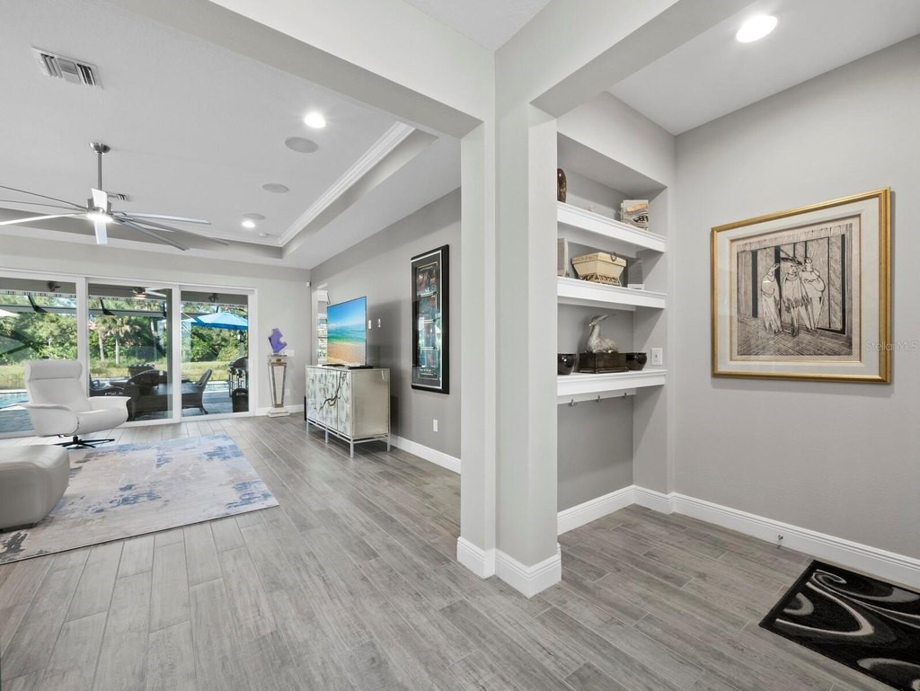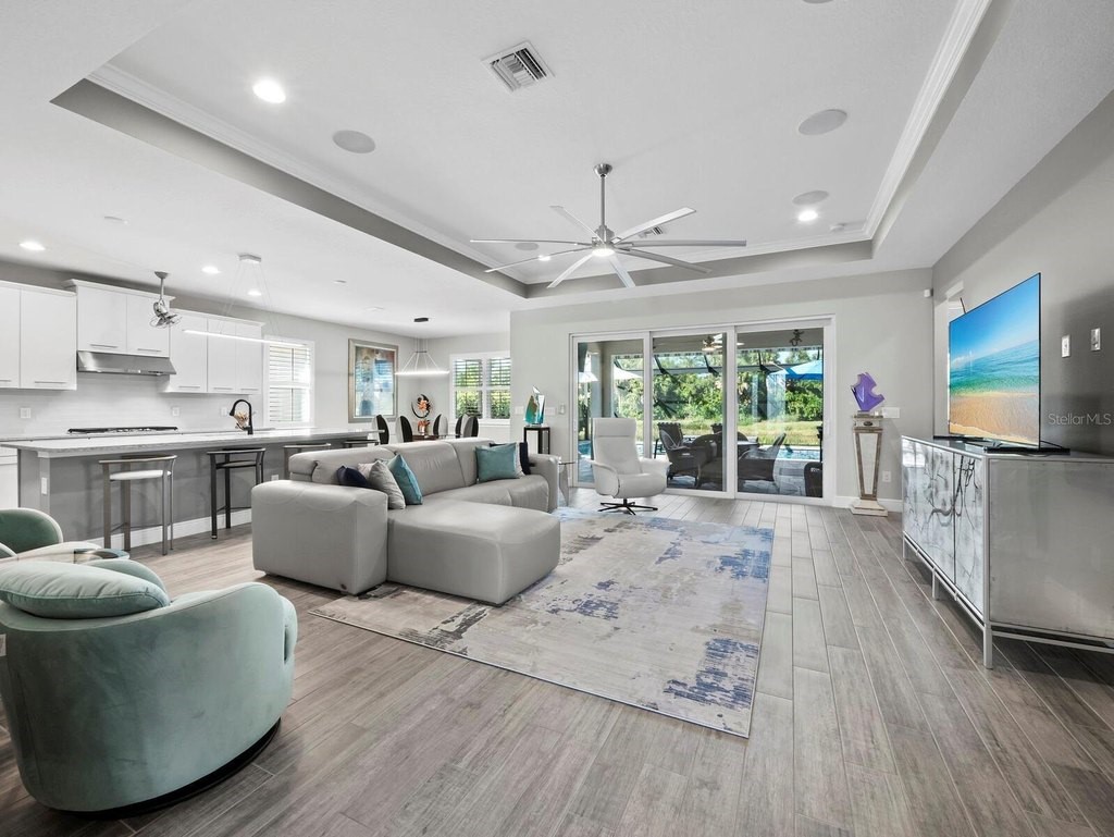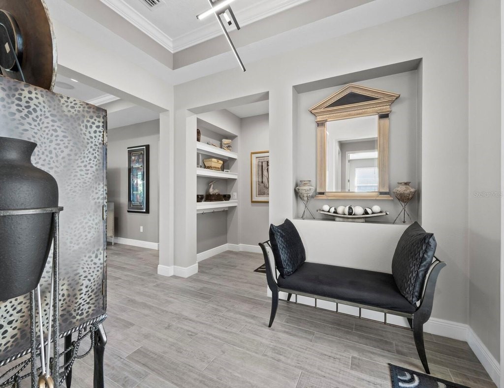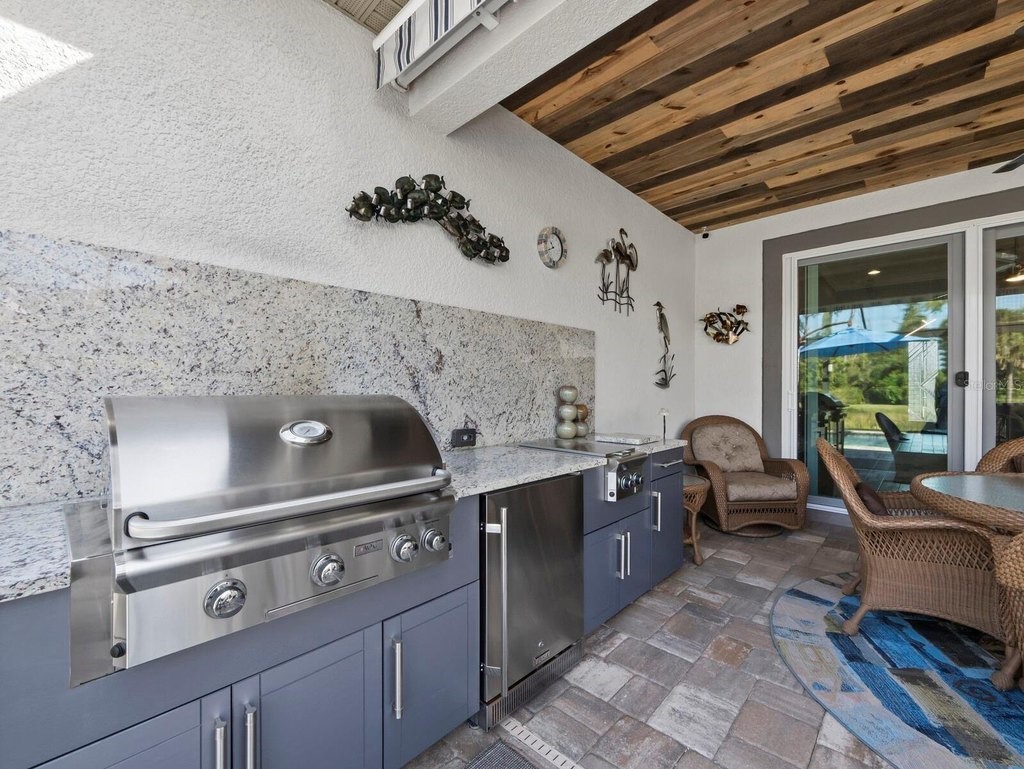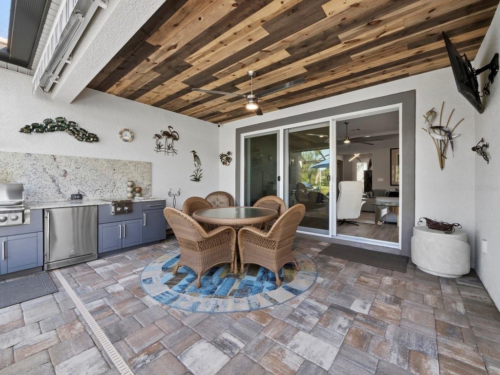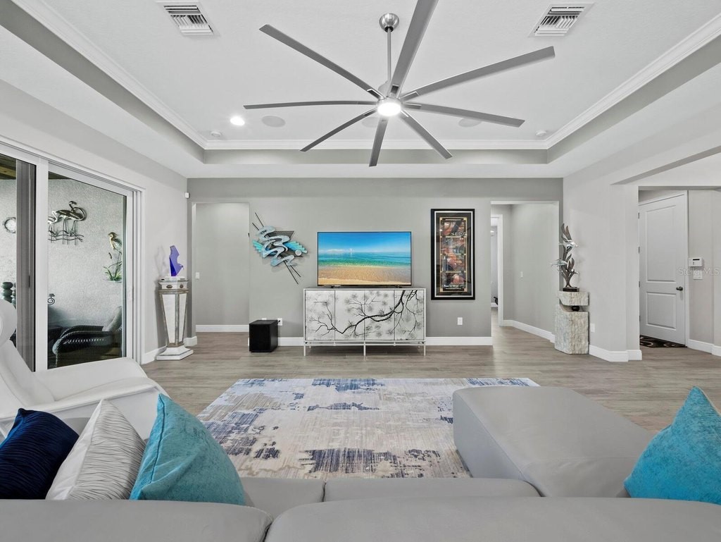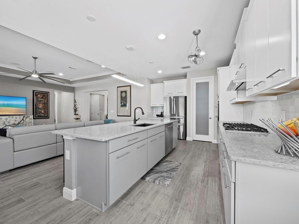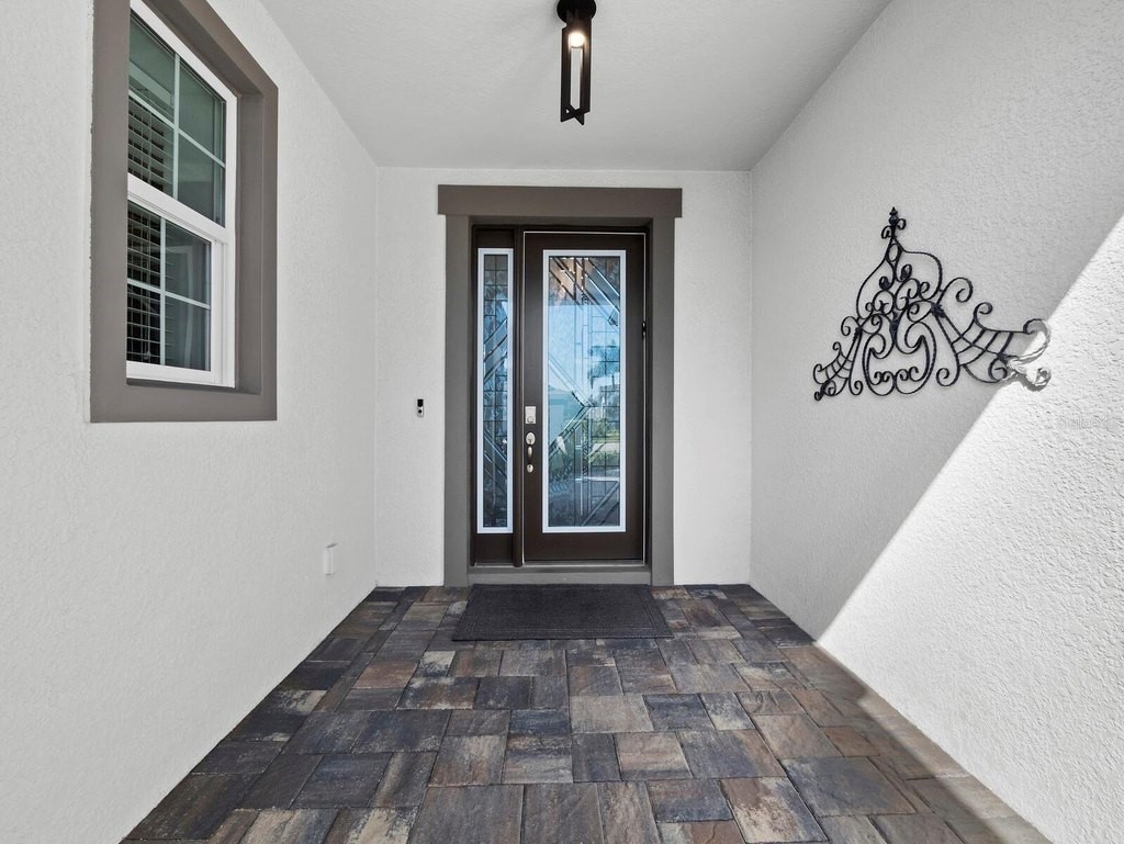 Under contract-accepting backup offers. Built in 2020, this West Indies-style home exudes sophistication with extensive upgrades and stunning natural light. Ideally situated on a lakefront home site, the property offers picturesque preserve and water views. Every high-end detail, meticulously completed in this gated Sunrise Preserve gem, offers immediate luxury upon arrival. The immaculate floor plan includes 2, 261 sq. ft. of thoughtfully designed living space, featuring 3 bedrooms, 3 bathrooms, a pool, and 3-car split garage with epoxy floors and upgraded paver driveway. Lush, tropical landscaping accented by hard wired LED lights provide impressive curb appeal. The welcoming front entrance sets the stage leading into the home with commanding views. Upon entering through the striking glass front door, the tone is set for the entire space. The large interior open layout features 9-10 ft ceilings paired with tray ceilings and crown molding, adding to the sense of spacious elegance. Plank tile floors flow throughout the home, complemented by tasteful designer touches such as upgraded light fixtures, plantation shutters, custom storage closets, and ceiling fans. Adjacent to the great room, a gourmet kitchen includes sleek cabinets, upgraded stainless steel appliances, and a generous walk-in pantry with a frosted glass door. Premium quartz countertops extend to a spacious island featuring an upgraded kitchen sink for both style and practicality. The dining room seamlessly blends entertaining with amazing outdoor views. The screened-in lanai enhanced with additional lighting, creates an appealing transition from the great room through the hurricane impact sliding door. Step outside to the custom saltwater pool complete with colored lights, fountain bubbler, motorize sunshade, and a one-sided automatic privacy screen. A pool lounge area atop pavers and a summer outdoor kitchen completes this idyllic space for relaxing while enjoying tranquil lake views. The spacious primary suite features a well-appointed bathroom, with a large walk-in custom closet. Highlights of this luxurious en-suite bath include split dual vanities, premium granite countertops, and large walk-in shower with a bench. The split floor plan provides two additional bedrooms with custom closets and spa-like baths. The third bedroom can easily transform into an office with the custom desk, adding versatility to the home. The spacious laundry room designed for convenience, offering a barn door with frosted glass, lower cabinets with a utility sink, and two storage closets. Further upgrades include impact windows, hard-wired security package with two cameras, split AC systems, whole house natural gas generator, house surge protector, a 5.1 surround sound system, and a freshly painted interior (2023). The HOA fee includes complete landscape maintenance. Situated in the Gated Sunrise Preserve at Palmer Ranch, residents enjoy an affluence of amenities that exemplify resort-style living. These include a large clubhouse with a fitness center, yoga room, a spectacular heated pool and spa, bar lounge area, bocce ball, tennis courts, and more. This community is conveniently located near fabulous Gulf beaches, shopping, fine dining, medical facilities, and top-rated schools, providing a truly upscale living experience.
